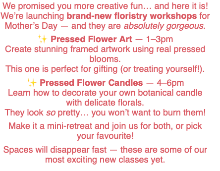 We use only seasonal, sustainable, and eco-friendly flowers, all locally sourced and lovingly prepared. From flower pressing to hand-tied bouquets, each workshop invites you to create something beautiful while enjoying the mindful rhythm of nature.