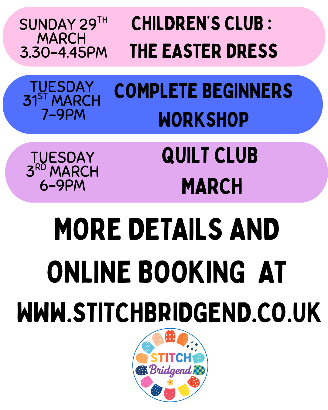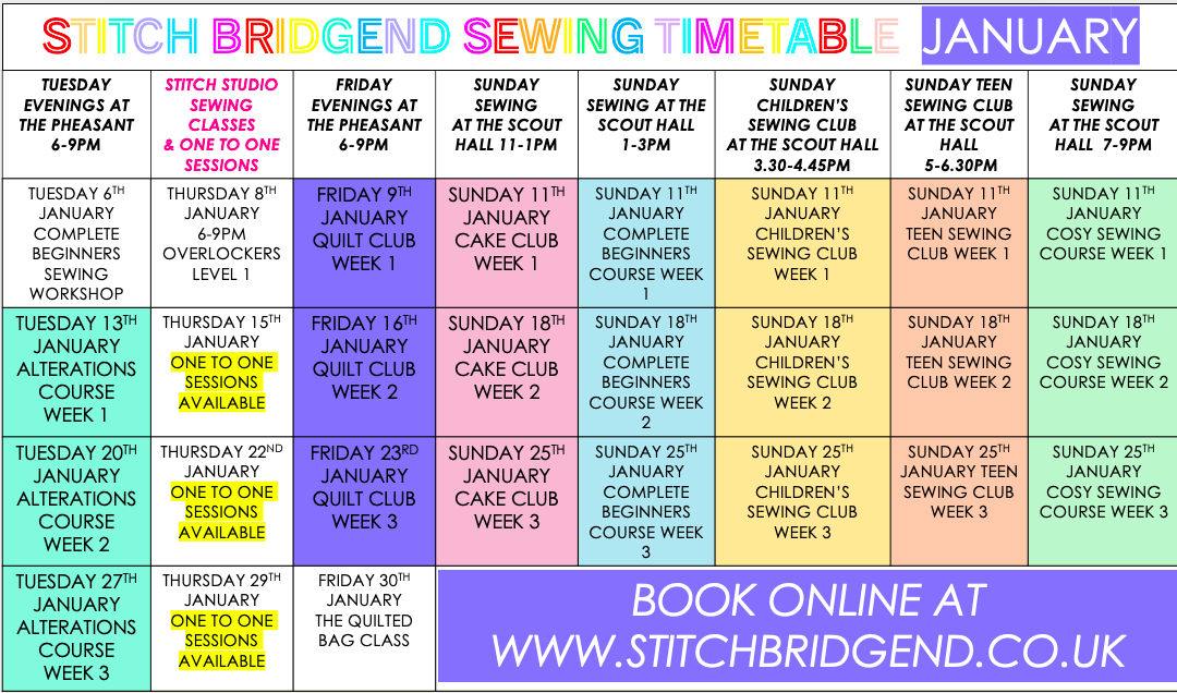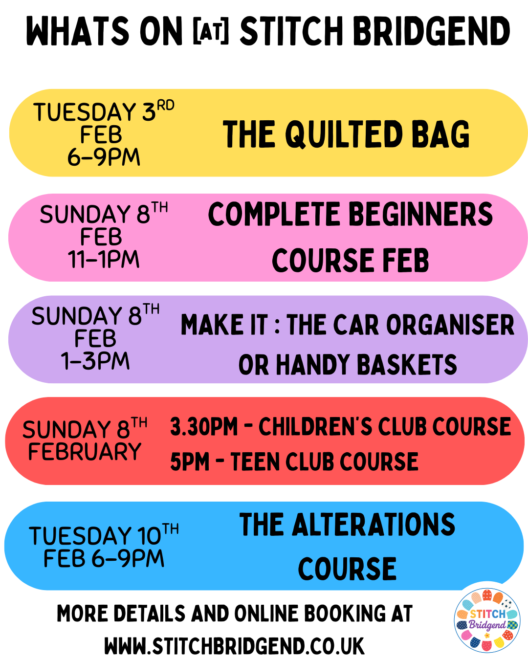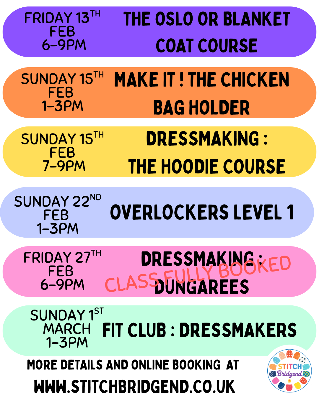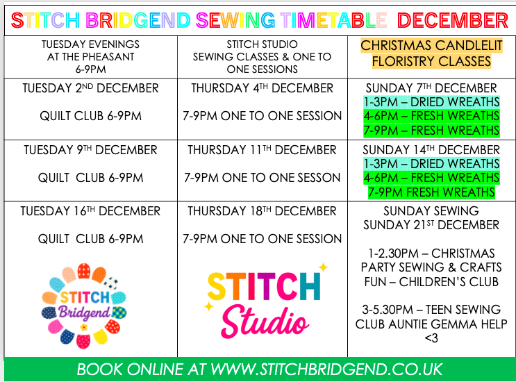 If we at Stitch Bridgend need to cancel a class for any reason a credit code refund will be emailed to you to use against future classes/workshops.